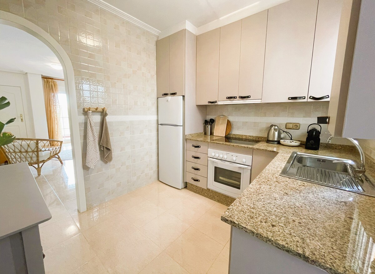 Árasán sómasach ar an 1ú hurlár, aerchóirithe le hardaitheoir a cheadaíonn rochtain gan chéimeanna ar an linn snámha mhór agus ar charrchlós laistigh de phobal geataithe. Níl ach tiomáint 5 nóiméad nó rothar leictreach/scútar ar cíos chuig roinnt tránna áille. Siúlóid 100m ó Ionad Tráchtála la Fuente le bialanna, beáir agus ollmhargaí c.25. Níl ceann de na hionaid siopadóireachta is mó sa Spáinn, la Zenia Boulevard agus ‘stiall’ beáir agus bialanna Cabo Roig ach 2 mhíle ar shiúl. Tá cúig chúrsa gailf a bhfuil duaiseanna buaite acu i bhfoisceacht 5 mhíle
