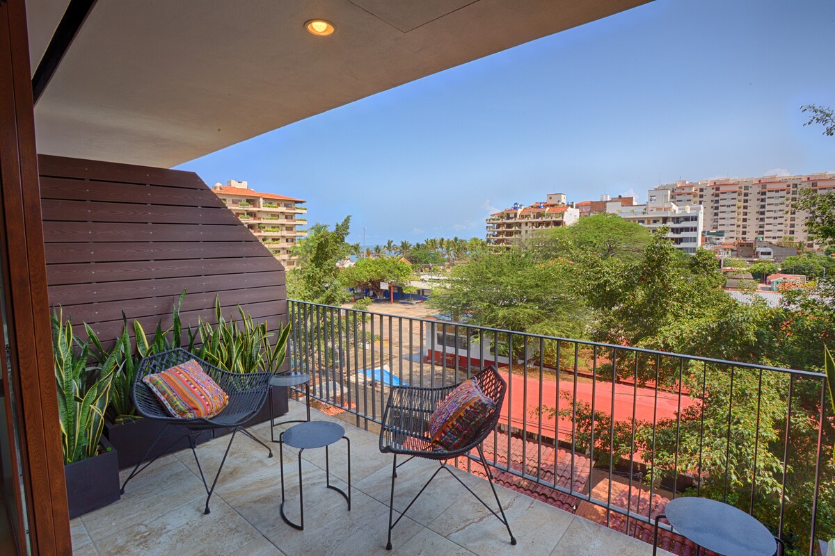 Stiúideo teolaí ar an 11ú hurlár le radhairc scuabtha ar an aigéan agus luí gréine dodhearmadta ó do bhalcóin phríobháideach. Roinnteoir sleamhnáin saincheaptha a chruthaíonn mothú 1 sheomra leapa, ag scaradh an áit suí le teilifís ó chodladh taobh thiar den roinnteoir, gan cur isteach ar sholas nó ar fhuaim. Codlaíonn tolg fairsing aoi breise go compordach. Cuirtear an leaba in aice leis an mbalcóin le haghaidh fuaim mhín na dtonnta farraige. Níl rochtain ar an trá ach céimeanna ar shiúl - saoire ghearr fhoirfe shuaimhneach in Puerto Vallarta.