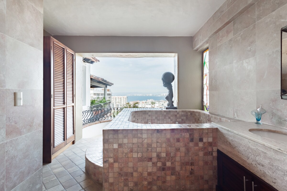* Léirmheasanna 5 réalta d'aíonna * 5 sheomra leapa 4, seomraí folctha en - suite * 6 lá sa tseachtain tís w/ cócaireacht seirbhís suas le 2 bhéile in aghaidh an lae (bia agus deoch costas breise) * Siúl 15 nóiméad go dtí an trá * 3 bhloc go Basilio Badillo * Concierge ar an láthair * Seirbhísí níocháin * Radharc 270 céim ar Bay, Puerto Sléibhte Vallarta agus Siarra Madre * Tírdhreachú / crannchur príobháideach, páirceáil le cónaí sa chathair * Roku agus , 55" teilifís w/ Wi - Fi le haghaidh sruthaithe * Beár fliuch & déantóir oighir * Linn snámha théite phríobháideach & beárbaiciú