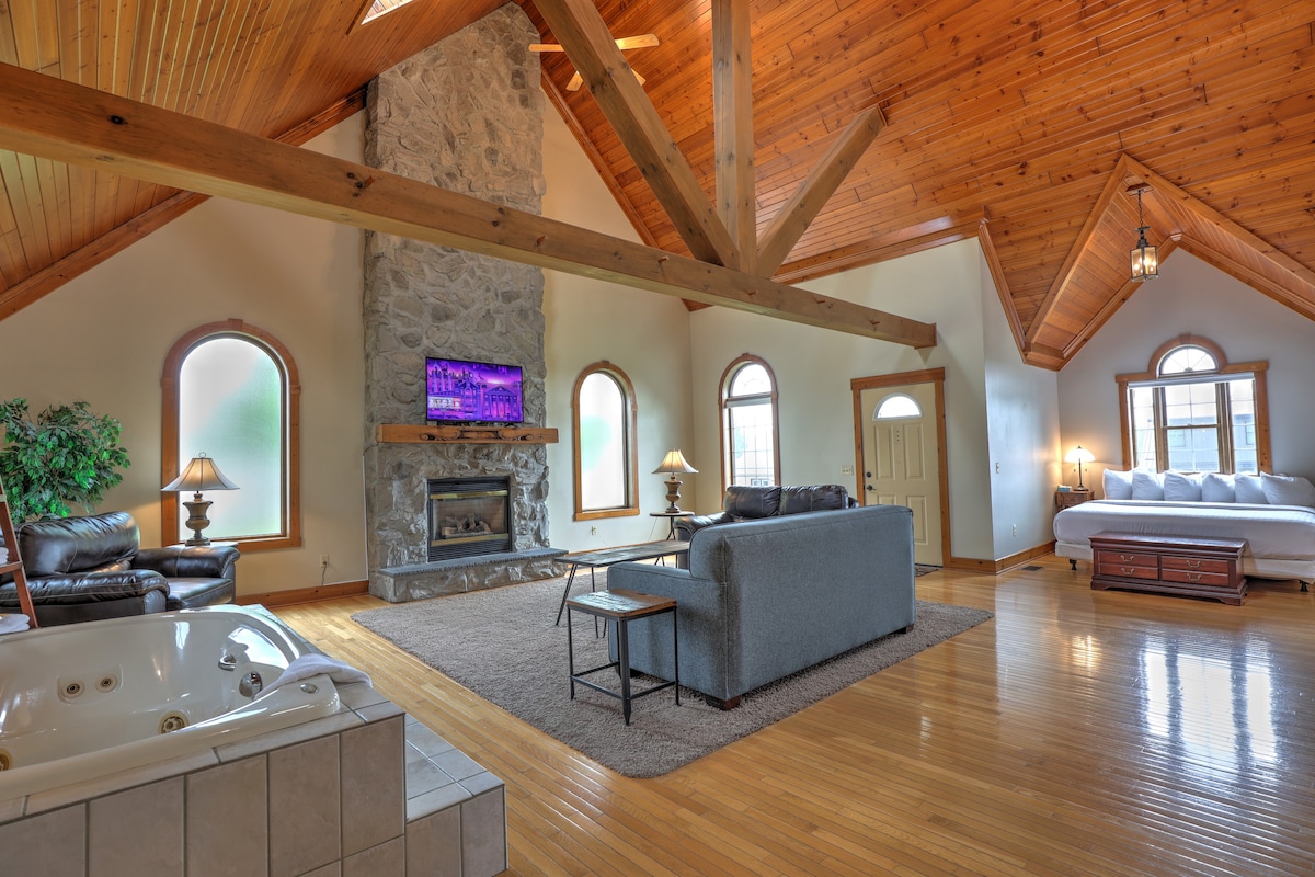 Cábán gleoite teolaí nua - athchóirithe i gcábán 2025 ar 60 acra coille atá foirfe do shaoire ghearr lánúineacha. 8 nóiméad go dtí lár na cathrach iontach le haghaidh siopadóireacht a dhéanamh ar bhúitíceanna, ar bhia, ar fhíonlanna áitiúla, ar ghrúdlanna agus ar dhrioglann! Bain sult as suaimhneas agus suaimhneas i suíomh na ndúlra. Cluthar suas go dtí teallach ollmhór dóite adhmaid cloiche laistigh agus ar an bpóirse scagtha. Tá uisce earraigh nádúrtha nádúrtha sa tobán te príobháideach úrnua agus tá sé díreach taobh amuigh den doras ón gcábán agus tá sé ag breathnú amach ar locháin an earraigh nádúrtha.