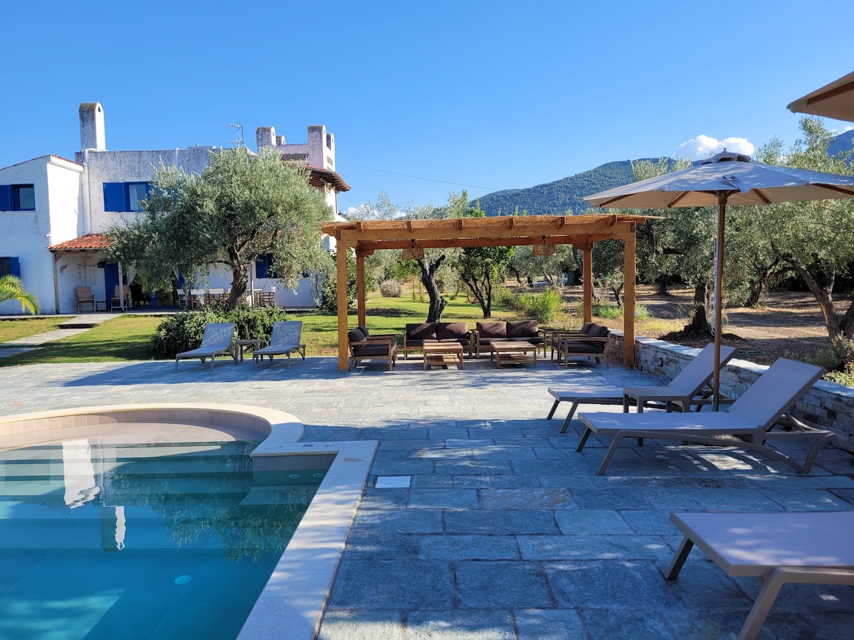 This two level cottage is inside a beachfront olive grove , has a quiet and secluded beach and a beautiful swimming pool. Ideal for 2 families or a company of 9 people, who want to spend their holidays together having at the same time their independence. Relax and enjoy your summer or winter holidays, in a pristine, peaceful, Greek countryside, surrounded by the crystal clear waters of North Euboean Gulf and the beautiful Mediterranean nature.