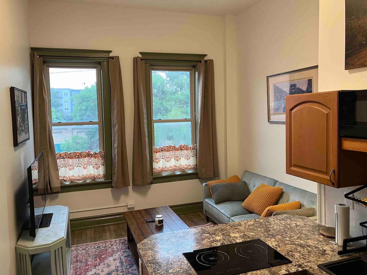 Bain sult as maidin mhall agus an ghrian ag scagadh trí na cuirtíní sa spás stiúideo teolaí seo, ag súimín caife nó tae de réir mar a thagann an lá. Lig do scíth i scáth tráthnóna an chrainn fuinseoige ar an deic i gclós fálaithe príobháideach. Grill béile blasta i limistéar na cistine lasmuigh, ansin téigh ag siúl tráthnóna i gceann thiar stairiúil Loveland chun breith ar an ngrian ag luí thar na sléibhte, ansin sleamhnaigh isteach sa tobán te chun an lá a mhúscailt faoi shoilse caife, nó inis scéalta timpeall tine sa pholl dóiteáin sa chúlchlós.