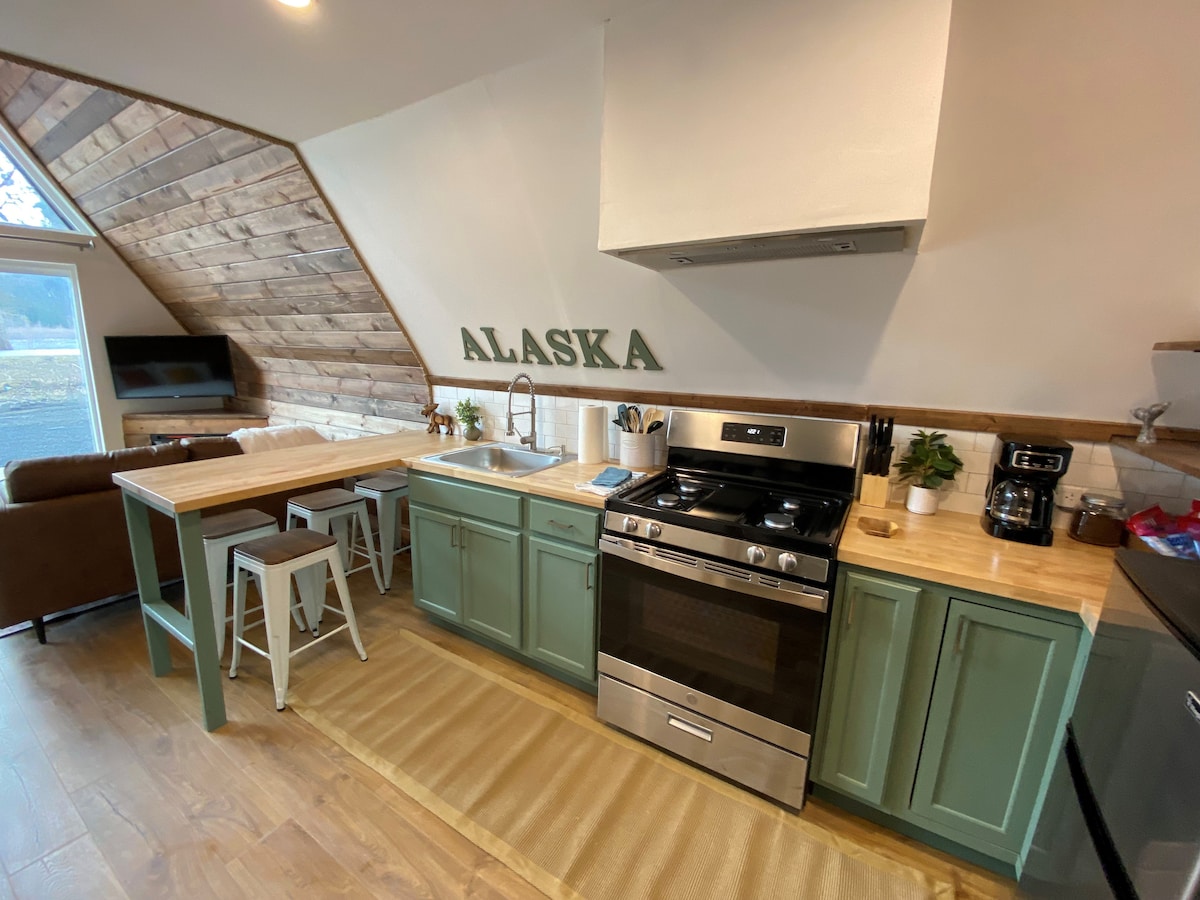 Teachín álainn i gclós cúil an tí caife stairiúil áitiúil. Tógadh an teach beag bídeach saincheaptha seo chun páirt a ghlacadh sna radhairc mhóra, a bhfuil aghaidh ó dheas orthu. Tá ár dteachín sa suíomh foirfe i lár Seward, ach tá sé suite go príobháideach sa chúlchlós freisin agus tá sé cosanta ó thrácht turasóireachta. Cuireadh gach mionsonra san áireamh agus an spás ealaíonta seo á chur le chéile againn, agus táimid ar bís lena roinnt leat!