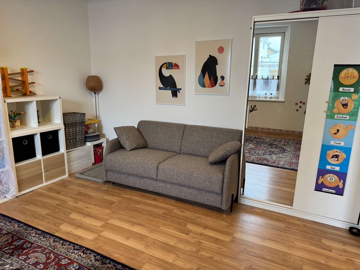 Suigh siar agus lig do scíth sa spás ciúin galánta seo. Déanann spás oibre, Wi - Fi agus ardán ag breathnú amach ar an gclós duilleach an t - árasán 55m2 atá foirfe do mhic léinn. Tá sé feistithe go hiomlán le seomra folctha deas, téamh urláir agus leaba dhúbailte, oiriúnach do lánúineacha singile agus do lánúineacha. Tá cliabhán agus rothair ar fáil ach iad a iarraidh. I ngarchomharsanacht thrá agus fhoraois na Danóibe, áit a bhfuil go leor bealaí rothaíochta agus fánaíochta. I gcarr 15 min. go Krems, 40 min. ar an mbus.