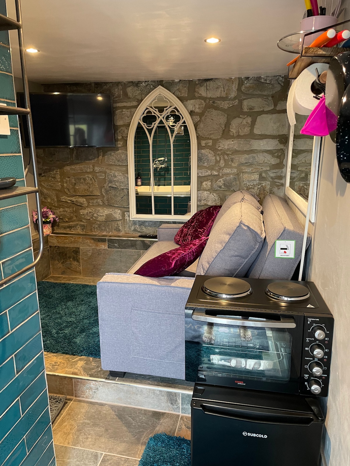 Is spás dlúth stiúideo é Y Cwtsh atá oiriúnach do lánúineacha, do thaistealaithe aonair, nó do chairde atá sásta an leaba a roinnt. TARRAINGÍONN AN LEABA THOILG AMACH I LEABA DHÚBAILTE CHUN CODLADH AR A MHÉAD BEIRT. Tá rochtain ar Omnitub domhain na Seapáine laistigh den spás maireachtála. Cuirtear trealamh cistine agus gach rud a theastaíonn uait chun féinfhreastal ar fáil. Gheobhaidh tú rogha tae, caife úr & séasúir le haghaidh cócaireachta. Sa mhionchuisneoir, tá roinnt earraí bricfeasta ilchríochacha ann chun go mbainfidh tú taitneamh as.