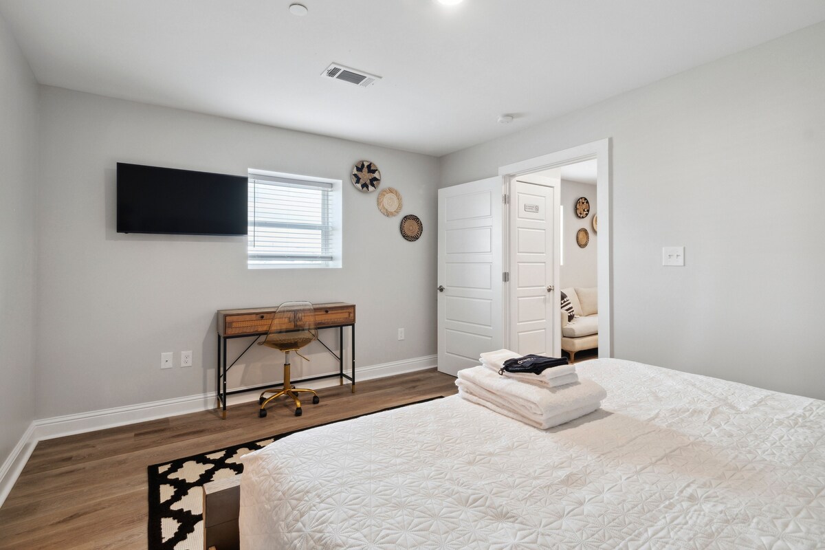 Fáilte go dtí ár seomra óstáin Bayou, áit a ngabhann an t - ambiance an charm an swamp an Deiscirt. Tá seomra suí, seomra leapa na Banríona, seomra folctha agus cistin sa seomra seo. Tá tolg, cathaoir sclóine le bord beag agus tábla caife foirfe chun do scíth a ligean sa seomra suí. Tá cuisneoir/reoiteoir agus miasniteoir sa chistin ionas go mbeidh tú ar do shuaimhneas. Déantar gach mionsonra i seomra le téama Bayou a choimeád go cúramach chun eispéireas suaimhneach a chur ar fáil d'aíonna, díreach i gcroílár New Orleans.