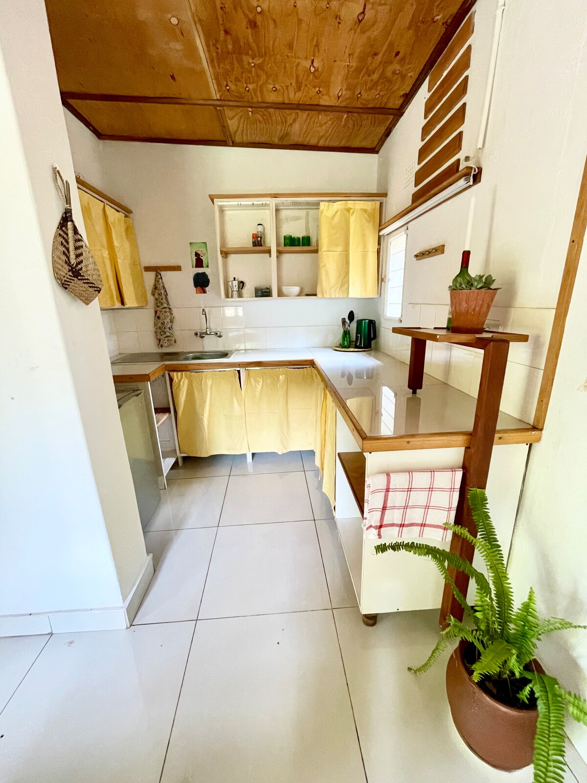 Coinnigh simplí é ag an áit shuaimhneach seo atá lonnaithe go lárnach. Tá áit chodlata do 2 sheomra leapa sa teach aíochta 1 sheomra leapa seo (leaba bhanríona) agus is féidir é a thiontú ina dhá sheomra ar iarratas. Dearbhaigh do shuaimhneas intinne le soláthar cumhachta na Gréine ionas nach gcaillfidh tú rud ar bith! Tá Teach Kaho suite i gcomhdhúil shábháilte agus go lárnach i mbruachbhaile ciúin Ceantair 10 nóiméad ó shiopaí agus ó Lár na Cathrach.