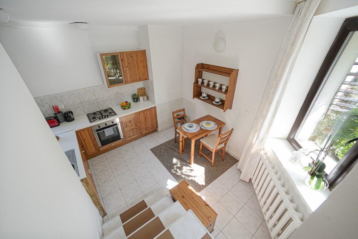 Tá ár lochta fairsing gan smál i gcroílár Krakow Old Town, ag barr teach baile mór traidisiúnta ón 15ú haois. Is árasán stiúideo galánta é ina bhfuil spás urláir iontach mezzanine. Lonnaithe i lár an bhaile ghnóthaigh bheoga, nuair a bheidh tú laistigh den árasán beidh tú ar do shuaimhneas, ag tabhairt aghaidh ar chlós ciúin agus radharc ar threetops agus cloigíní na heaglaise ag bualadh i gcéin. Cruthóidh an t - am a chaith tú ag an áit álainn seo in Krakow cuimhní cinn a chuirfidh gliondar ar na blianta amach romhainn.