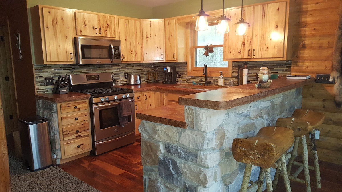 Cábán príobháideach atá suite ar 3 acra. 1 leaba/1 seomra folctha. Codlaíonn sé suas le 4 aoi. Tá leaba ar mhéid banríona sa seomra leapa, tá leaba lae chomh maith le dhá recliners sa seomra leapa, agus tá tocht aeir ar mhéid na banríona ar fáil. Is minic a roghnaíonn aíonna cócaireacht a dhéanamh amuigh faoin aer ar an lasair oscailte nó faoin bhfoscadh paitió greille. Is é an firepit iontach chun cuimhní cinn a dhéanamh faoi na réaltaí. Ón gcábán seo ní bheidh ort do bhréagáin a threorú go dtí ceann an chosáin. Brionglóid eachtránaithe easbhóthair.
