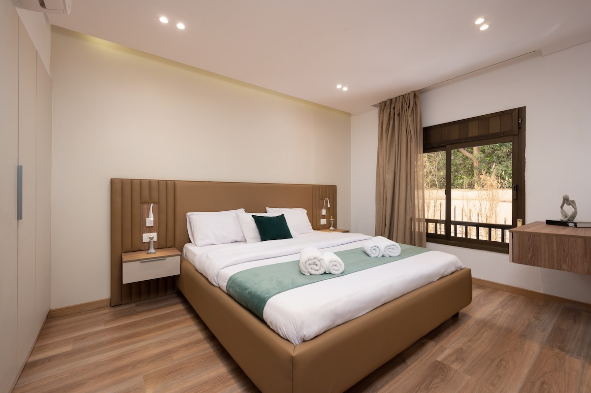 A cozy, stylish space made for easy relaxation with comfy lazy-boy seating, huge Tv, screen, a two peaceful bedrooms, and a sunlit green patio perfect for morning coffee. Just a 3-minute walk from Road 9 with its vibrant restaurants, cafés, bars, supermarkets, fresh veggies and fruits markets. The Giza Pyramids are about 15 minutes away, and the Grand Egyptian Museum is around 20 minutes by car.