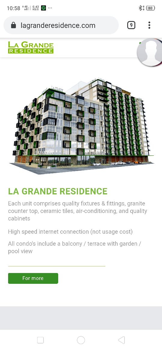 Stiúideo Nua ar an 9ú hurlár i gCéim 2 de La Grande Residence. Bain sult as d'fhanacht le rochtain ar 3 linn snámha, spá, giomnáisiam, bialann, siopa caife agus beár. Faigh taithí ar shlándáil 24/7 agus fiú uisce sconna inólta. Tá an stiúideo nua - aimseartha seo feistithe go hiomlán le hidirlíon ardluais, aerchóiriú agus teilifíseán cliste. Lonnaithe go háisiúil in aice le hionaid siopadóireachta, bialanna agus ionaid siamsaíochta, is é an áit is fearr le fanacht in Angeles é, ag tairiscint compord agus áisiúlacht araon.