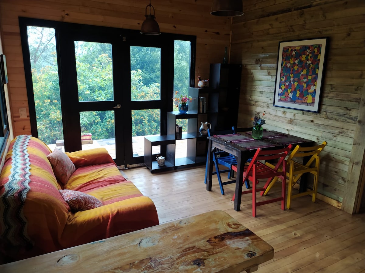 Déan iniúchadh ar dhraíocht na háite uathúla seo! Lonnaithe i measc foraois bháistí thrópaiceach, díreach 33 km ó Bogotá (thart ar 55 nóiméad), cuireann an cábán seo compord agus draíocht ar fáil. Tógtha 8 méadar ar airde i measc na gcrann, bainfidh tú taitneamh as radhairc iontacha, canadh na n - éan, caonach, bromeliads, agus sruth suaimhneach. Suite i gceantar tuaithe cairdiúil inrochtana. Táimid ag tnúth le heispéireas dodhearmadta a chur ar fáil duit!