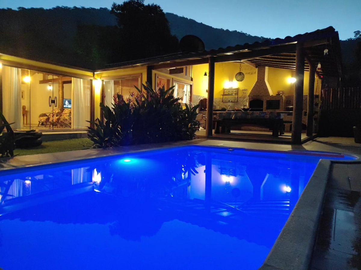 Bem vinda (o) ao @nossocanto_serrarj. Aproveite na montanha o charme moderno desta casa. Casa com piscina, churrasqueira, fogueira externa, de frente ao Rio e com um céu estrelado nas noites claras. São dois quartos (suites) com ar condicionado, camas de excelente qualidade e um barulho do Rio confortante e temos wifi a fibra. Caso queira uma pessoa para ajudar com a limpeza e comida durante a estadia, indicamos profissionais da região com o pagamento direto à ajudante.