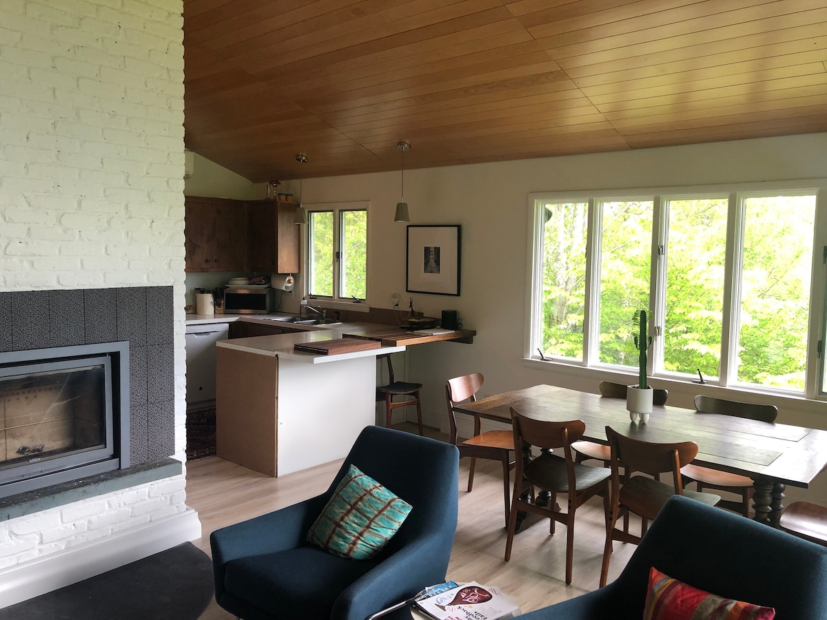 Lig do scíth ag an teachín cluthar, dea - chumtha seo ar an Clay Brook, áit ar féidir leat taitneamh a bhaint as fuaim na habhann i gcomparáid le suíomh síochánta, adhmaid. Cé go mbraitheann sé iargúlta, táimid lonnaithe go háisiúil ag Sugarbush Access Rd agus Rte 100, rud a fhágann go bhfuil sé éasca teacht orainn! Le gach ceann de na nithe is díol spéise Mad River Valley in aice láimhe, tá an teachín foirfe le haghaidh taitneamh a bhaint as ar feadh na bliana, cibé acu is mian leat fuarú sa sruth, marshmallows rósta ag an bpoll dóiteáin tar éis fánaíocht, sásamh a bhaint as an duilliúr titim, nó do scíth a ligean tar éis sciála!