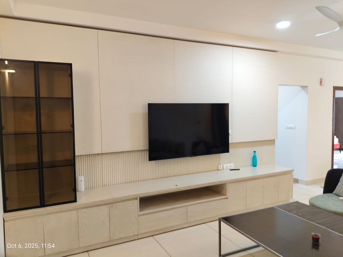 Welcome to our Stylish 3 BHK apartment, perfect for short or long stays. Enjoy 3 AC bedrooms with private baths, a cozy living room with a 43" Smart TV, high-speed WiFi, and an indoor swing. The kitchen is fully equipped with a gas stove, microwave, RO purifier, fridge, and utensils. Relax at the spacious dining table or read from our book collection. Located near Hitech City Metro, Rameshwaram Cafe (100m), US Visa Center (1km), Cable Bridge, IT hubs,