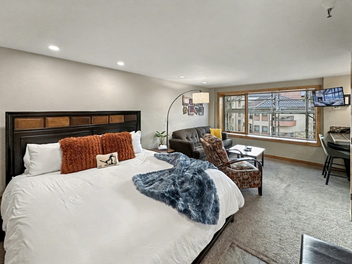Village at Breckenridge Resort! The view from this modern studio is stunning! Wake up every morning to the beautiful Rocky Mountains right out your window. The Bear's Den is a cozy studio condo with a King bed and comfy sofa sleeper that can easily sleep 4. The space is perfect for a family of 4, romantic getaway, or a friend's holiday trip! The location is the best in town! Just steps from the Quicksilver lift on Peak 9, ski school, hiking trails, and abundance of local shopping and award win