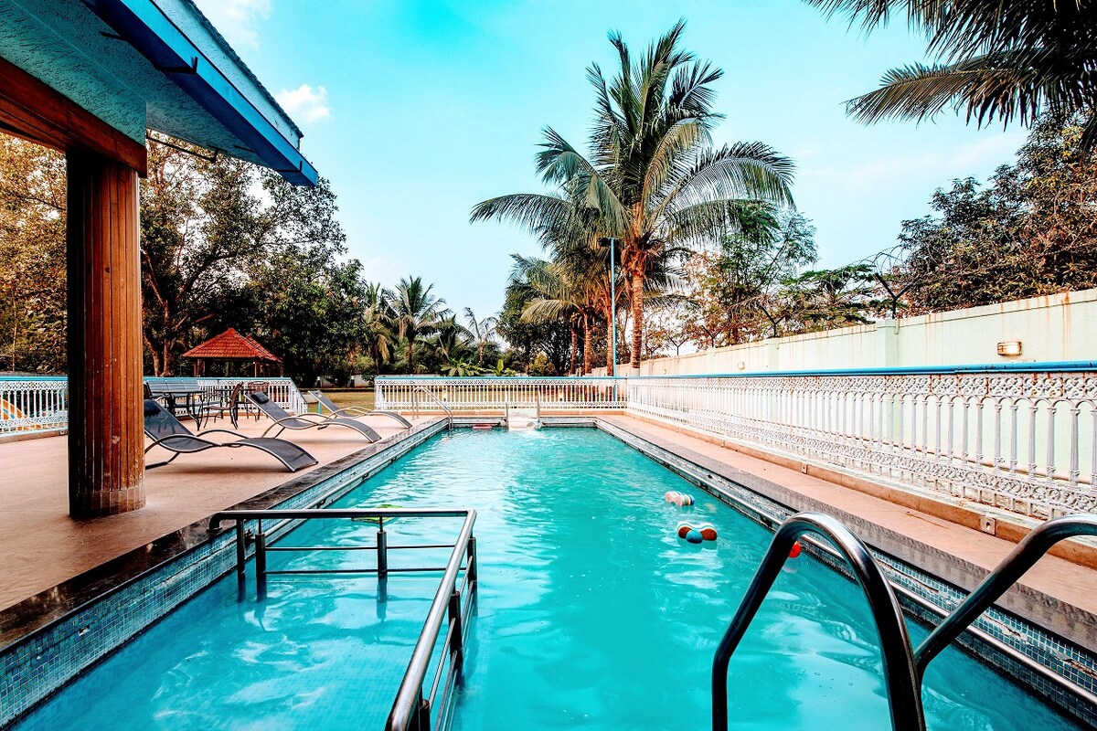 🏡 Villa 4BHK suite sna Cnoic shuaimhneacha Anjaneri, 25 nóiméad ó Nashik agus 2.5 uair an chloig ó Mumbai - Codladh 8–16+ aoi, tá linn snámha phríobháideach agus 4.5 seomra folctha ann - Limistéir mhóra chónaithe agus lóinseála ina bhfuil mionbheár cluthar - Cistin lánfheistithe agus spás itheachán galánta laistigh - Cócaire ar an láthair ar fáil (muirear breise) le haghaidh béilí nó beárbaiciú blasta - Réadmhaoin atá oiriúnach do pheataí🐕🐶 Foirfe do shaoirí teaghlaigh, d'ócáidí speisialta, nó do thearmainn shuaimhneacha in aice le Fíonghoirt Sula🍷agus Teampall Trimbakeshwar.🛕