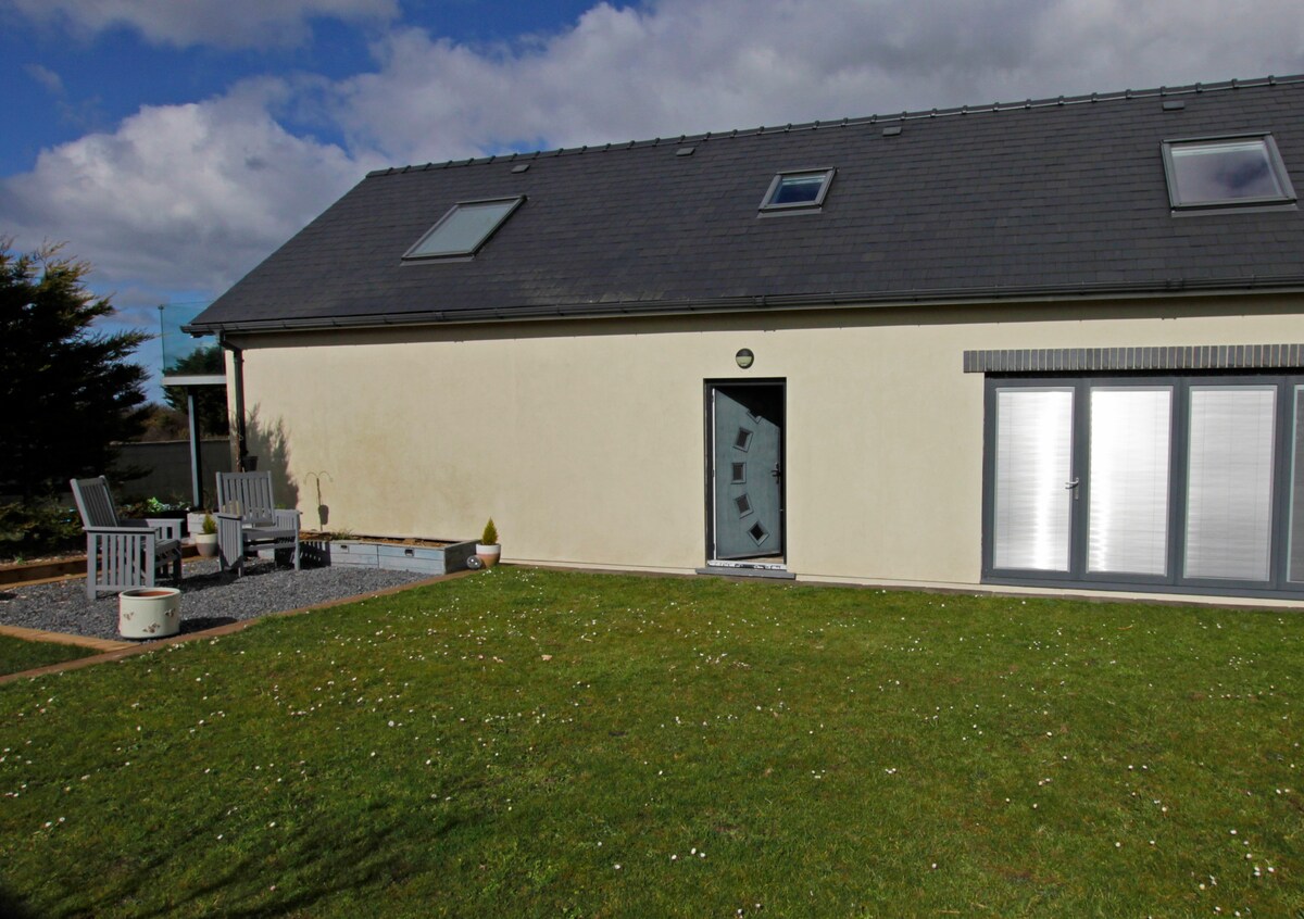 (8 gcodladh) Suite i suíomh tuaithe suaimhneach, ciúin, agus go leor páirceanna agus crainn lánfhásta thart air. Cistin plean oscailte le beár mór bricfeasta a théann gan dua isteach i spás maireachtála sóisialta ina bhfuil teallach lomáin lárnach tarraingteach agus tolg clúmhach cúinne. Bain lántairbhe as an saol lasmuigh/ laistigh trí na doirse déphillteacha 5m ar fad a oscailt ar limistéar mór deice le bord picnice a bhfuil príobháideacht ag baint leis. Foirfe do BBQanna/Teallach.