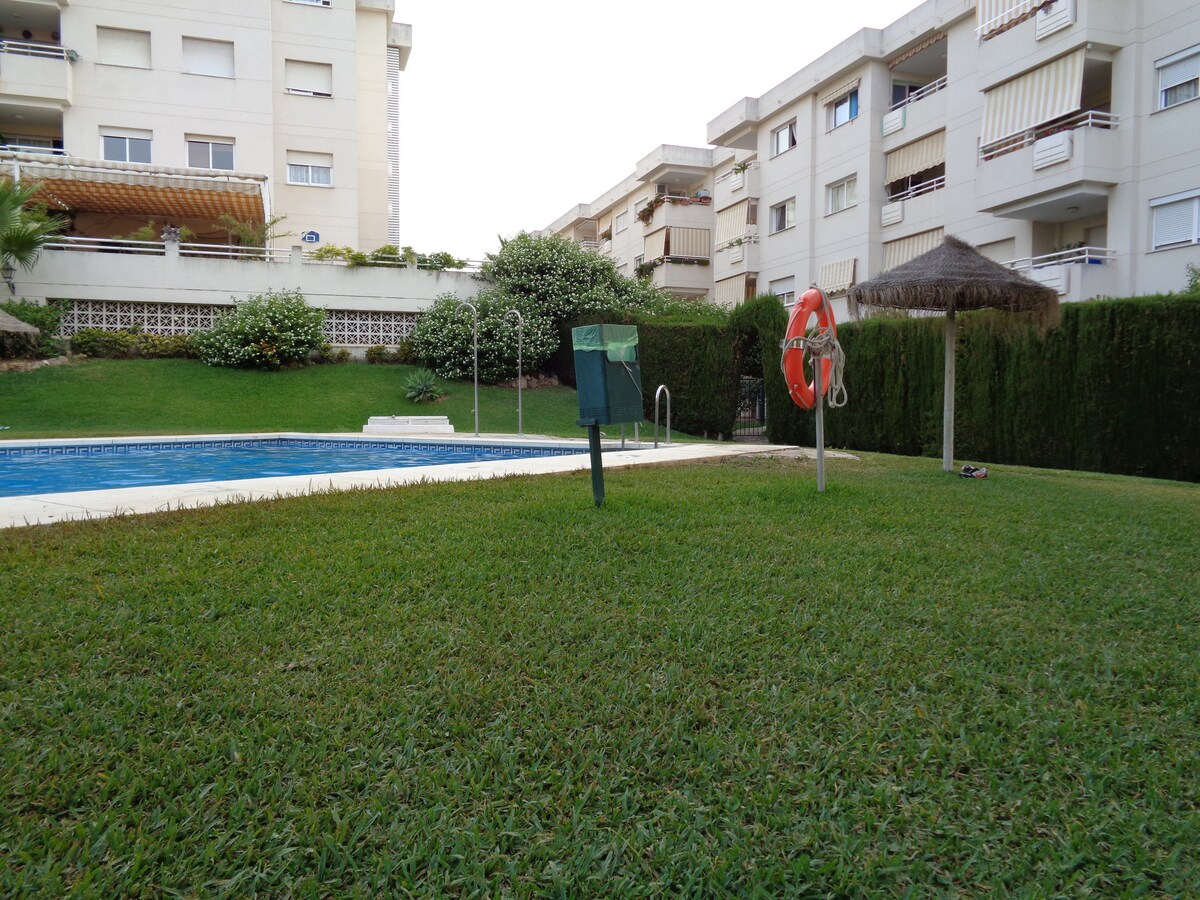 Cozy, bright, entirely renovated quality flat on the front line with sea views from the sunny and large balcony, both rooms and the bathroom. Features his and her shower, full kitchen, 2 tennis courts, 2 swimming pools (1 for children) large gardens, private beach area, free beach beds and private parking. We have a sandy beach with Blue Flag status and direct access to the sea boardwalk. Near Marbella and La Cala with 75+ restaurants and many shops walking distance. Strict cleaning.