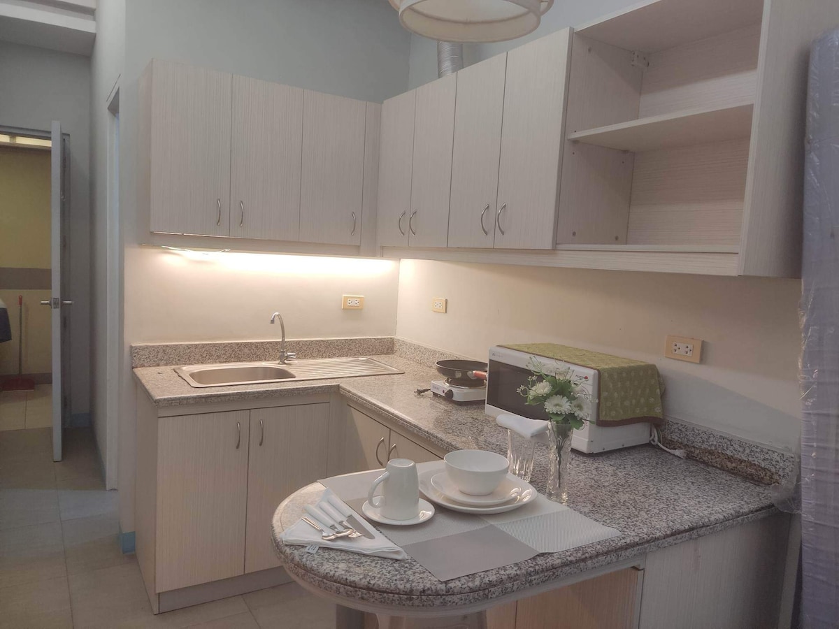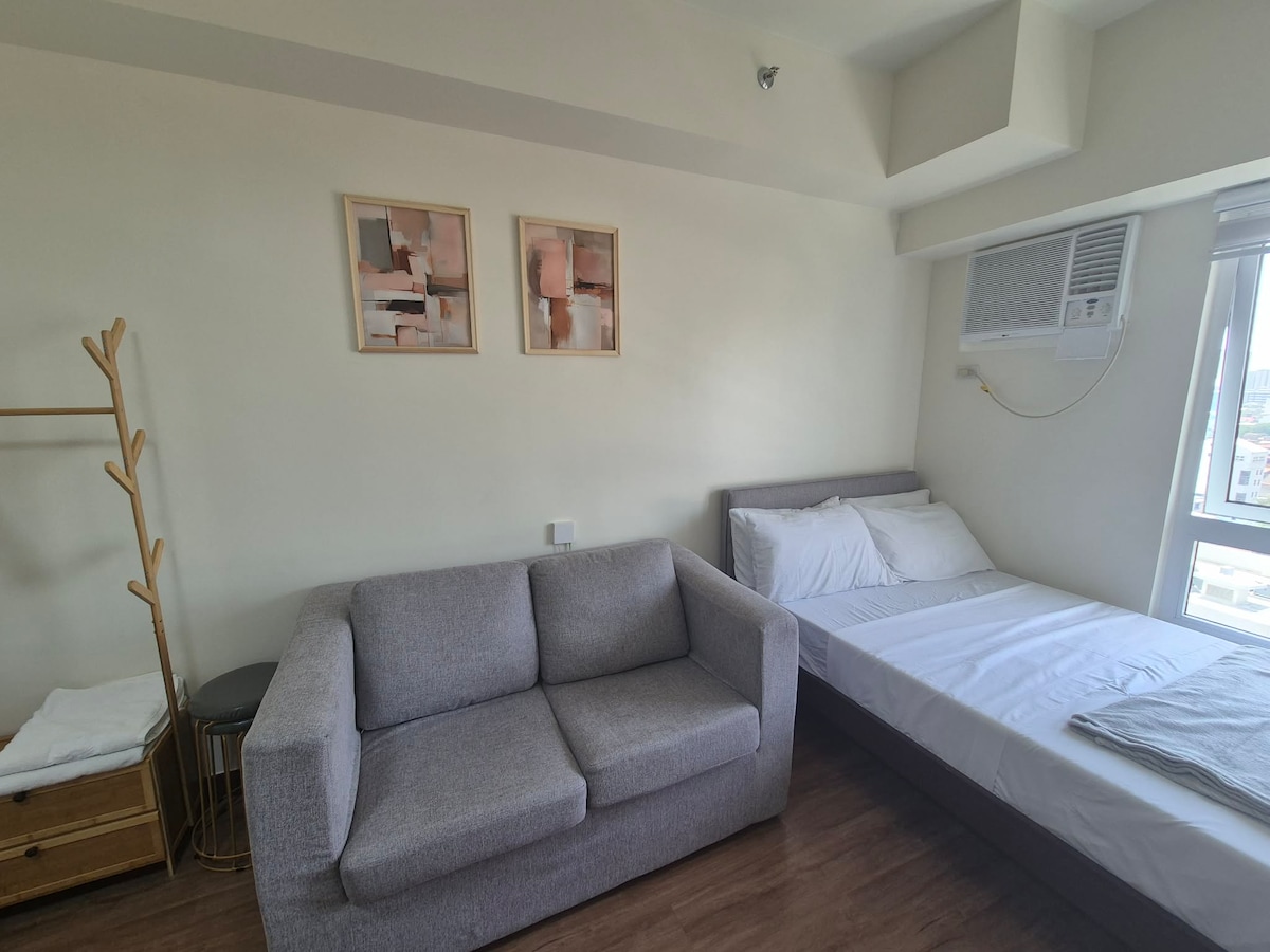 Nua - aimseartha & fairsing 1BR w/BALCÓIN agus linn snámha ach cúpla ciliméadar ón aerfort agus laistigh d'achar siúil ó go leor nithe is díol spéise i gceantar Bhá Manila. Cistin dea - fheistithe, seomra suí faoi sholas na gréine, leaba chompordach, Wi - Fi, Netflix, aircon & TV i do chónaí agus sa seomra leapa araon. Áit fhoirfe le fanacht do lánúineacha, do theaghlaigh bheaga nó do thaistealaithe gnó. Áit súgartha sabhna agus páistí - saor in aisce le húsáid Linn snámha - saor in aisce suas le triúr aíonna; P200 do gach aoi breise.