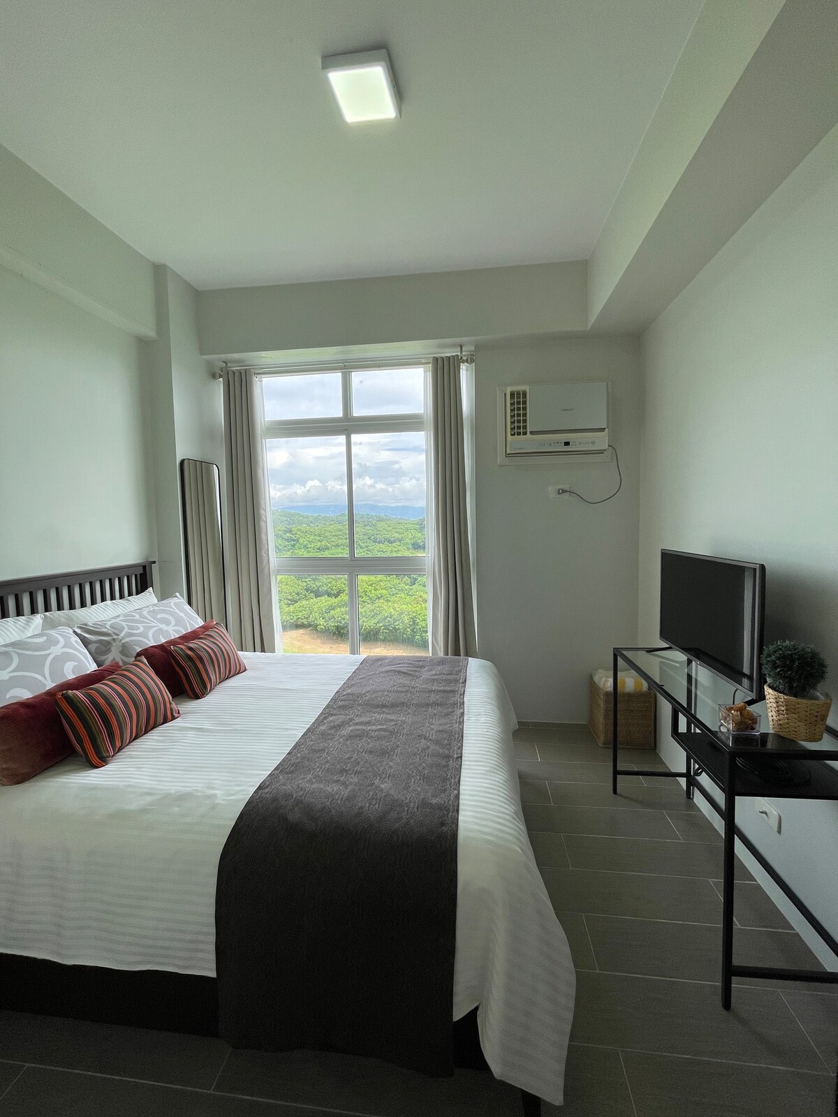 Bain sult as spás, suaimhneas agus radhairc ó bharr an chnoic ar Boracay. Táimid lonnaithe in AltaVista de Boracay Hotel & Leisure Residences. I do thréimhse fanachta tá seirbhís tointeála ionaid saoire saor in aisce le haghaidh tréimhsí fanachta gearrthéarmacha ó AVB go White Beach, rochtain ar an linn snámha (an chéad 24 uair an chloig), slándáil, gineadóir, agus rochtain ar an gClubtheach. Táimid faoi fhad siúil ó Thrá Puka, 5 nóiméad ar an mbealach ó City Mall, 10 nóiméad ar an mbealach ó Stáisiún White Beach 1 agus 15 nóiméad ar an mbealach ó Stáisiún 2 D'Mall. Cuirtear tuáillí folctha, tuáillí trá agus mataí trá ar fáil san aonad.