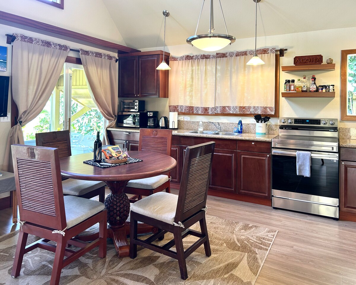 Fáilte go dtí Teachíní Gairdín Haiku, áit fanachta cheadúnaithe ar Fheirm agus Leaba is Bricfeasta ar Chladach Thuaidh Maui (Cead #BBPH2017/0002). Is teachín gleoite é Kalani inar féidir leat caife a ól ar an lanai, dul ag spaisteoireacht ar chosáin ghairdín, torthaí séasúracha a bhaint, agus socrú isteach i rithim an oileáin. Bain sult as radhairc ar an aigéan agus ar an ngairdín, cithfholcadán príobháideach lasmuigh, agus spás maireachtála suaimhneach laistigh agus lasmuigh—díreach nóiméad ó Haleakalā, an Bóthar go Hāna, tránna, cosáin fánaíochta, bialanna, agus margaí feirmeoirí.