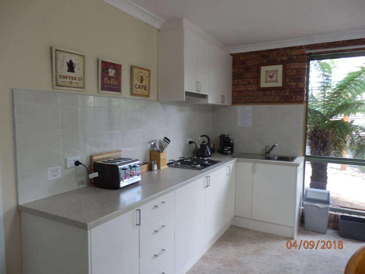 Árasán stiúideo féinchuimsitheach éadrom nua - aimseartha atá suite i gcúirt chiúin ina bhfuil radhairc iontacha ar an aigéan, ar lochanna agus ar inlet Mallacoota. Siúlóid ar thaobh an locha pictiúrtha 15 nóiméad chuig caiféanna, gailearaí, bácús agus ollmhargaí . Cistin lánfheistithe, tolglann plean oscailte le seomra leapa in aice láimhe agus seomra folctha nua - aimseartha ar leith. Áit phaitió beárbaiciú lasmuigh. Méid na Banríona agus leaba shingil i spás codlata.