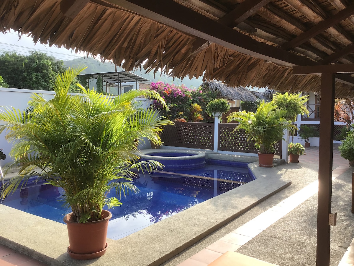 Completely furnished beach front studio style house, with Queen size bed, 2 single beds for 4 guests. There is room to accommodate 2 extra guests on floor mattress or an exrta full size bed for a total of 6 guests. Villa has full kitchen, bathroom with hot shower, dinning area TV and cable for stays of 3 days or more. Kitchen is equipped with stove, fridge, dishware and pots and pans for preparing meals. This clean and comfortable rental is located in a quiet, safe, uncrowded area, ideal for couples and families. Wi Fi internet access is available 24/7, cable TV, DVD and movies are available. For your convenience we offer breakfast, lunch, laundry service for a fee. Transportation service for short and long distances, day trips and trips of up to 3 days. Local bus stops right in front of property. Easy commute to nearby Shopping malls, movie theater, parks and museums in Portoviejo (30 minutes) or Manta city(40 min). Swimming pool, BBQ grill, ample parking and private dance floor on premise. Enjoy walks on the beach, bike riding, jogging or just relaxing in a hammock. For your comfort and convenience we have our own electric generator in case of power outage, so you'll still feel at home in a foreign country. This is certainly one of the few places where you can enjoy peaceful surroundings, a clean, comfortable ocean view villa, an almost private beach, a nice swimming pool, nearby restaurants, easy access to the city and all at a very reasonable price.