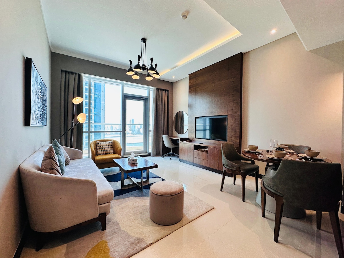 Tá stíl dá chuid féin ag an áit uathúil seo. 72 radharc farraige cearnach atá feistithe go hiomlán luxurious árasán seomra leapa amháin le balcóin. Tá sé suite i dtúr uathúil ina bhfuil saoráidí 5 réalta os comhair Óstán Four Seasons ag Bahrain Bay, an ceantar tosaigh farraige is áille i mBairéin. I mBairéin Bay is féidir leat taitneamh a bhaint as an siúlóid ar fud an uisce, canálacha uisce, páirceanna, trá, siopaí caife agus bialanna chomh maith le Tacsaí Uisce ar féidir iad a úsáid chun turas uisce a dhéanamh nó The Avenues Mall a bhaint amach.