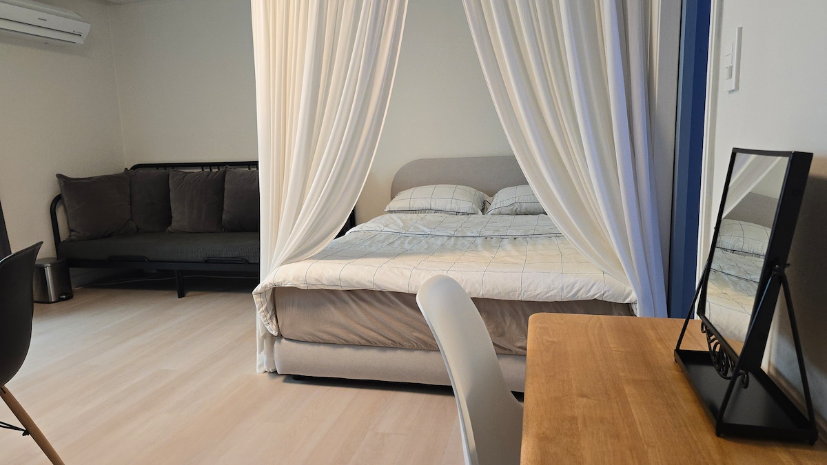 Brand-new building located in quiet residential area. Everything in easy reach, convenient store is in 1min walk. Please be informed that this accommodation is good for the price, not a fully-furnished or luxurious room. 신축 건물 이기에 깨끗하고 주택가여서 조용하고 주변에 편의 시설이 매우 가까이에 있어서 지내기에 편리합니다. 도보로 1분거리에 편의점 이 있습니다. 여기 숙소는 가격에 비해 좋은 숙소입니다. 필요한것들이 많은 고급숙소가 아닙니다. 참고해 주세요.