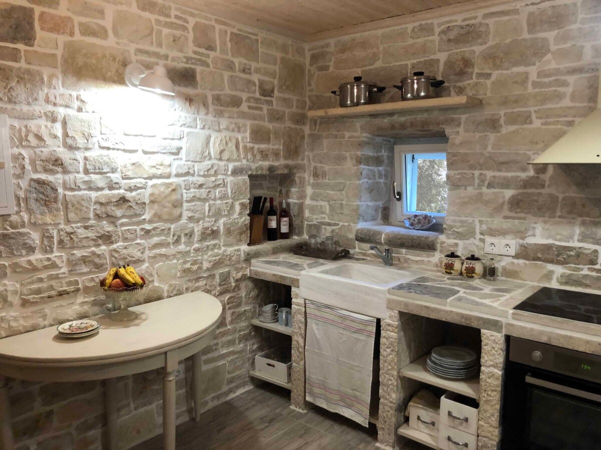 Teachín teolaí cloiche atá feistithe go hiomlán. Rinneadh é a athchóiriú agus aird mhór á tabhairt ar mhionsonraí agus an t - atmaisféar traidisiúnta á choinneáil. Lonnaithe i sráidbhaile álainn ciúin i lár oileán Paxos agus tá sé oiriúnach do dhaoine ar mian leo cuairt a thabhairt ar na sráidbhailte go léir ar fud an oileáin. Tá timpeallacht álainn nádúrtha timpeall air, atá lán de chrainn olóige agus bláthanna a thairgeann suaimhneas iomlán, suaimhneas agus príobháideacht.