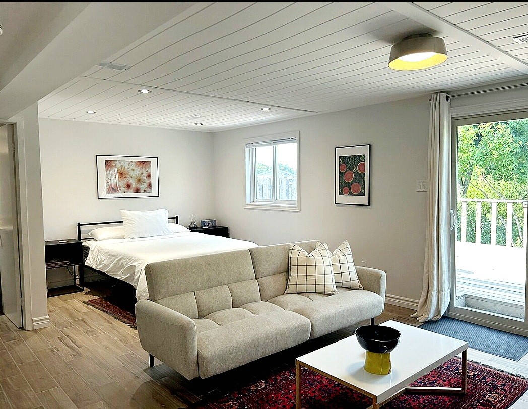 Rinne mé m'árasán a athchóiriú chun árasán íoslach 2 sheomra leapa lánfheistithe agus ar leith a bheith agam, le bealach isteach príobháideach ón bpaitió agus síos roinnt céimeanna. Tá an t-aonad suite gar do shiopaí, páirceanna, bialanna, cosáin, an luasbhealach agus 10 nóiméad ó Downtown Kitchener agus Uptown Waterloo, áit a mbíonn Margaí Feirme agus féilte iontacha amuigh faoin aer ag an samhradh ar an deireadh seachtaine. Cistin agus seomra folctha nua, agus go hiomlán feistithe (cuisneoir, sorn, micreathonnán, meaisín níocháin/triomadóir, miasniteoir), wi-fi agus teilifís chábla, teallach.