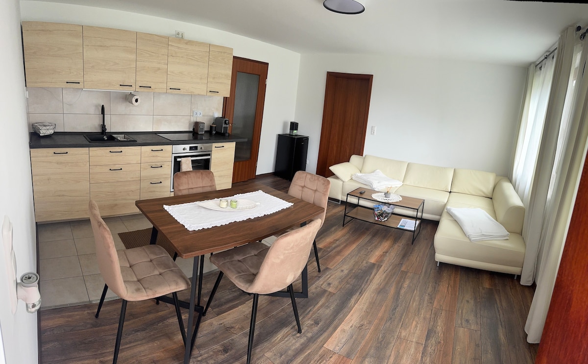 Tá an t - Árasán baile i bhfad ar shiúl ó chathracha callánacha. Is cuma má tá tú ag taisteal le haghaidh gnó nó má thógann tú cúpla lá saor le do theaghlach - gheobhaidh tú suaimhneas anseo, suaimhneas agus b'fhéidir chun a bheith an - ghar don dúlra. Tóg in árasán saoire 2022, tá cistin lánfheistithe ann, seomra suí atá deartha go hálainn, seomra leapa en - suite agus gailearaí (uaslíon an ghailearaí 1.7m). Tá ár ngairdín fós á thógáil ach tá rochtain dhíreach ar pháirceanna agus ar fhoraoisí.