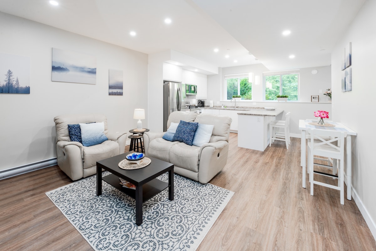 Éalaigh go dtí seomra íoslaigh teolaí 1BR atá suite i bhforaoisí Maple Ridge, ach siúlóid ghearr chuig Cliff Falls álainn. Scaoil le paitió príobháideach faoi shoilse téada gléigeal, nó cuach suas le haghaidh oíche scannáin ar an teilifíseán 50"le Netflix & Disney+. Bain sult as cistin iomlán, beár caife, níochán ar an láthair agus tolg tarraingthe amach dúbailte. Le cosáin ar leac an dorais agus suíomh síochánta coillearnaí, is é an teaghlach seo agus an áit cheilte atá oiriúnach do pheataí an meascán foirfe de chompord agus den dúlra. Tabhair faoi deara rochtain ar an staighre amháin.