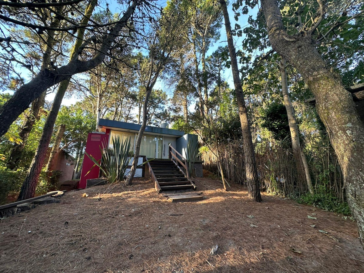 Casa moderna en altura, rodeada de bosque y tranquilidad. Amplia terraza y parque con parrilla y mesa de hormigón para disfrutar al aire libre. En la planta alta, ambiente único muy luminoso (living, comedor y cocina) con grandes ventanales y salida a la terraza. En la planta baja, dos cómodos dormitorios y baño completo. Cuenta con ducha exterior con agua caliente. Ubicada a 900 mts. del centro y 1000 mts. de la playa.