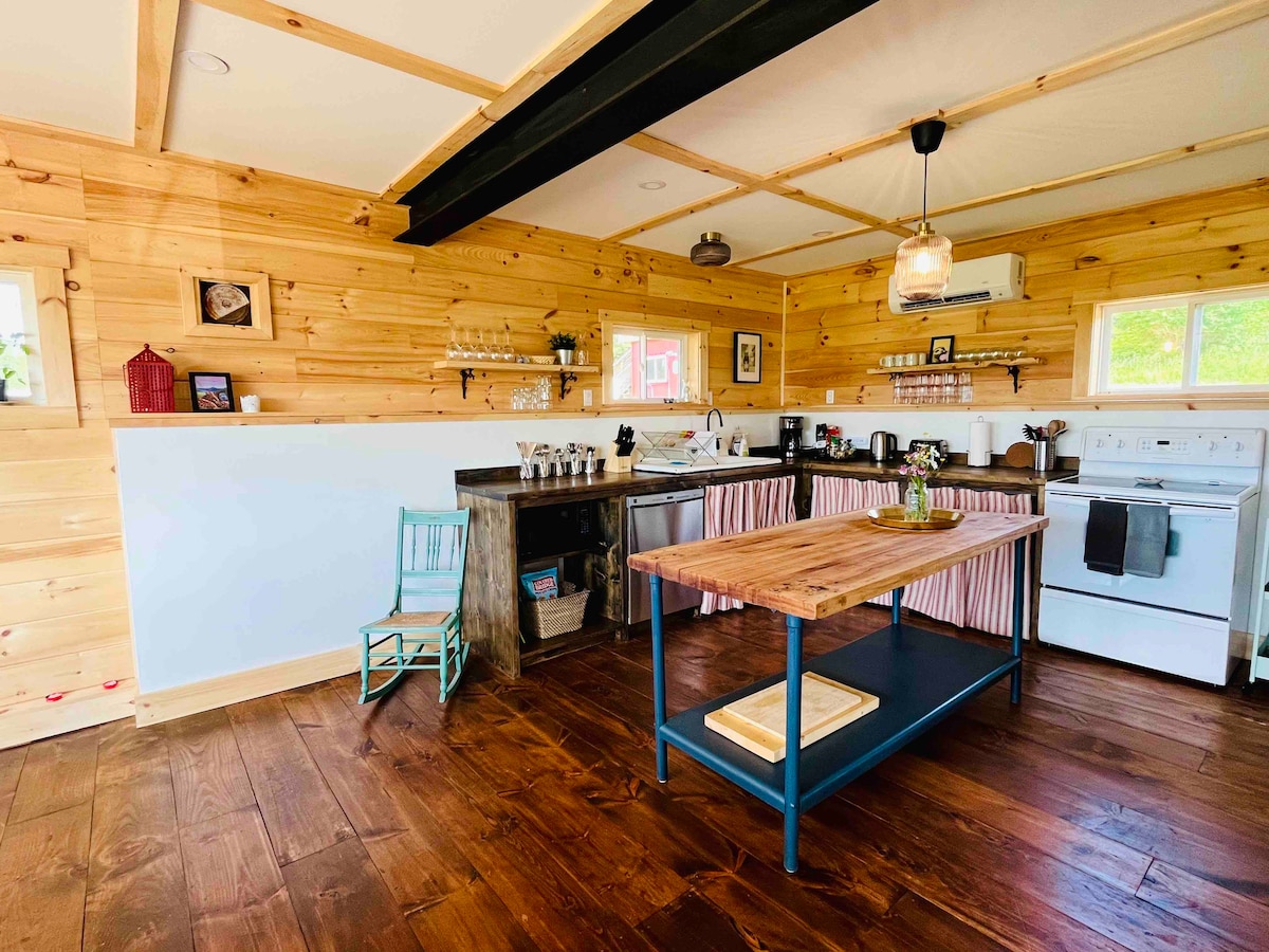 This meticulously crafted tiny house on wheels will bring you back to a traditional farm house feel. With a double bed on the main level, and a loft with a double bed, this tiny house comfortably sleeps 4. This tiny house offers a fully appointed spacious kitchen, a 3 piece bathroom including a flush toilet, as well as Wifi, smart TV, a wood stove, in-floor heating and AC. Kayaks & SUP’s, BBQ shelter use are included with your stay.