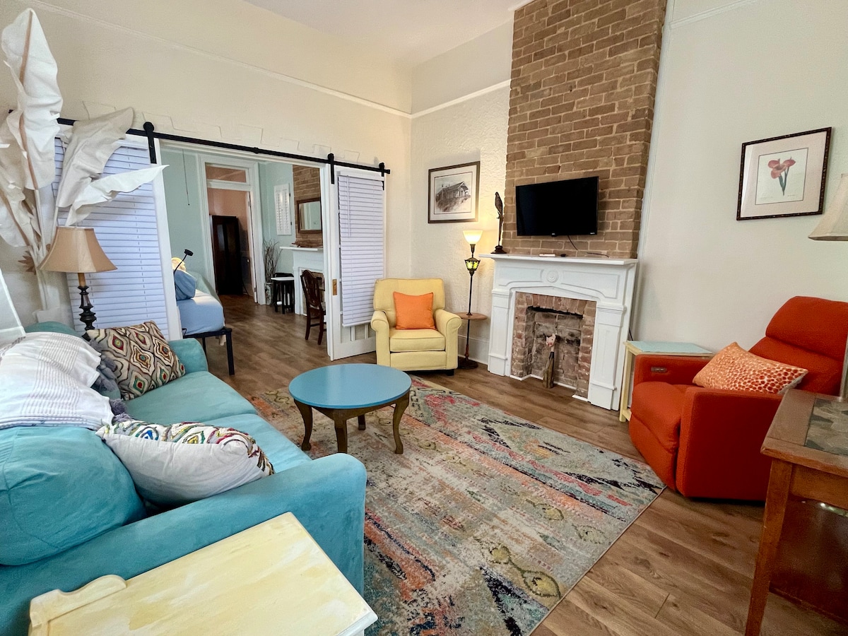 Fan i dteach clasaiceach New Orleans shotgun ar ascaill ar a bhfuil crainn le gach rud a theastaíonn uait agus tú ag siúl. Tá bialanna, beáir, earraí grósaera, agus gailearaithe ealaíne chomh gar agus atá dhá bhloc ar shiúl. Tá an teach trí sheomra príobháideach seo – seomra leapa amháin, seomra leapa/spás oibre amháin, cistin, seomra folctha agus seomra níocháin – oiriúnach do lánúin nó do bheirt dhlúthchairde. Tá rochtain ag aíonna ar chúlchlós comhroinnte.