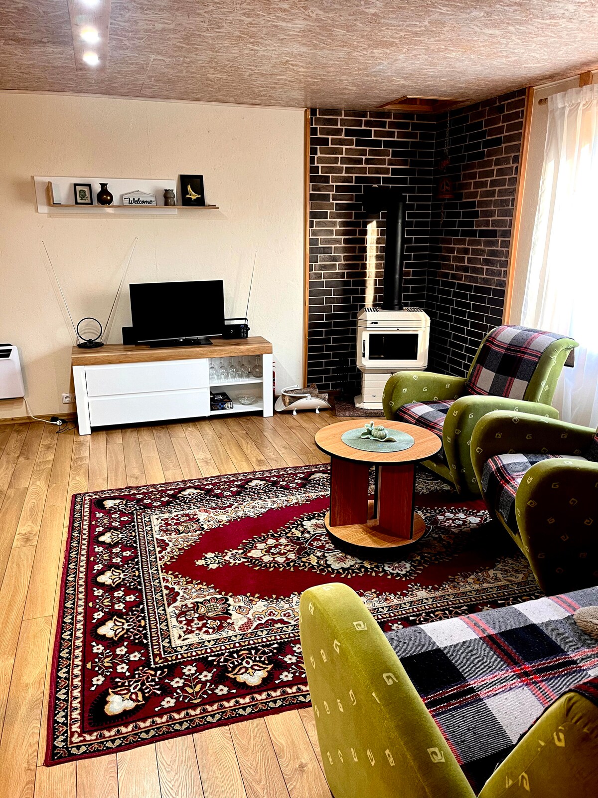 Teach baile mór teolaí ar imeall an bhaile inar féidir leat do scíth a ligean i síocháin ar feadh beirt nó leis an teaghlach ar fad. Táimid lonnaithe i lár an dúlra, tá clós príobháideach faoi dhíon le rochtain ar an uisce, ar an bpoll dóiteáin agus ar an ngríoscán. Seomra suí teolaí ina bhfuil teallach feistithe, ceangailte le cistinéad atá feistithe go hiomlán. Seomra leapa le leaba mhór dhúbailte ar an dara hurlár, leathnaíonn an dara leaba sa seomra suí. Tá seomra folctha lánfheistithe agus nua - aimseartha ann freisin ina bhfuil cithfholcadán agus meaisín níocháin agus triomadóir.