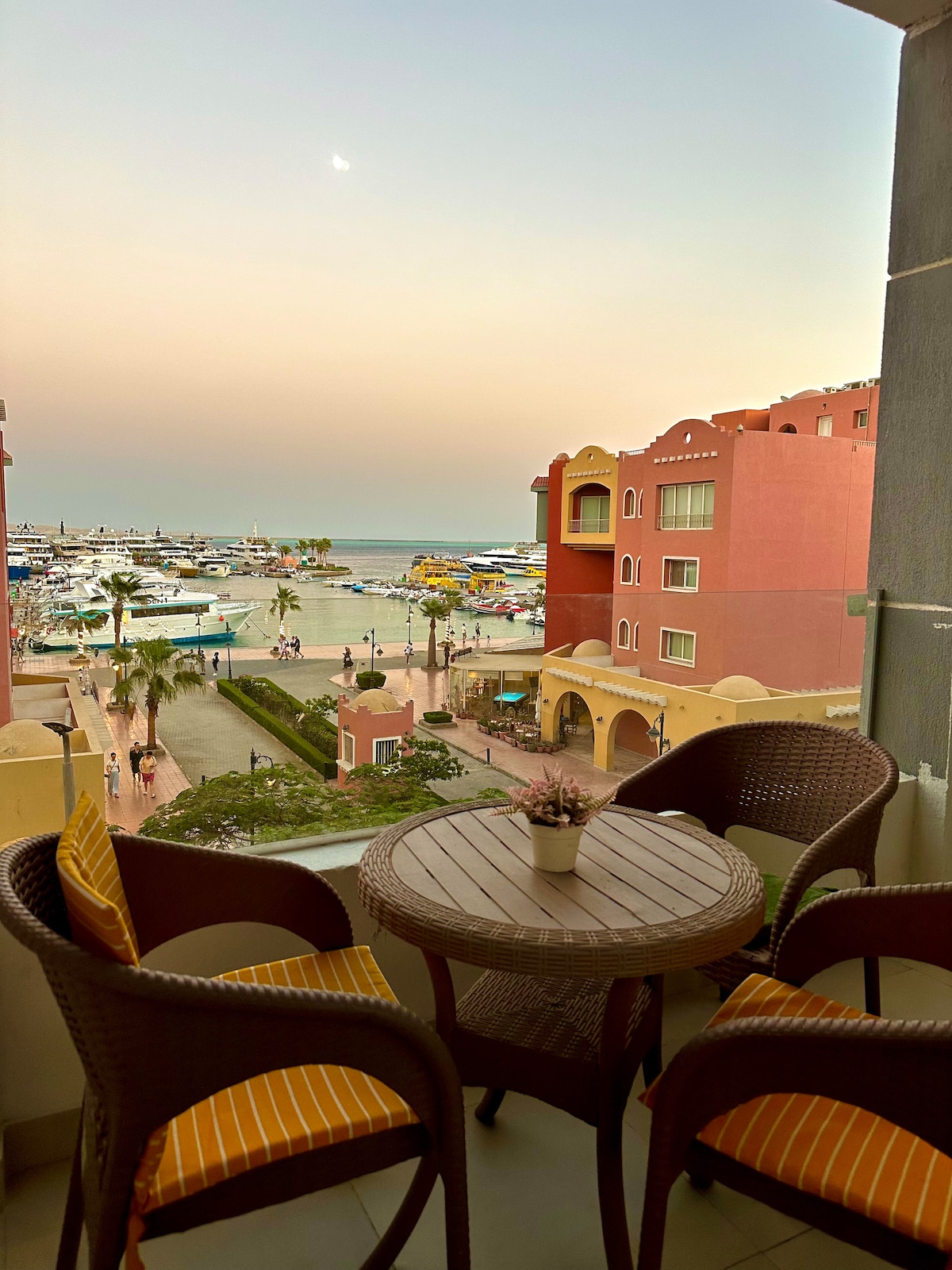 "Ní bhuaileann rud ar bith an t - árasán ardán dín príobháideach seo atá ag breathnú amach ar >Muir, Muiríne & Sléibhte <" Go hidéalach suite sa Marina Hurghada tá gach rud is mian leat ann. Teolaí taobh istigh le hardán dín príobháideach agus radharc iontach ar Mhuiríne, ar an Muir Rua agus ar Shléibhte do 2+2 aoi. (Tolg codlata, táille bhreise 25 € don 3/4ú aoi). ✔ Leaba dhúbailte chompordach agus tolg codlata ✔ 3 bhalcóin leis an radharc rochtain ar an✔ trá Blue Beach in Marina cistin ✔ laistigh agus lasmuigh le beár ✔ Wi - Fi Páirceáil ✔ saor in aisce