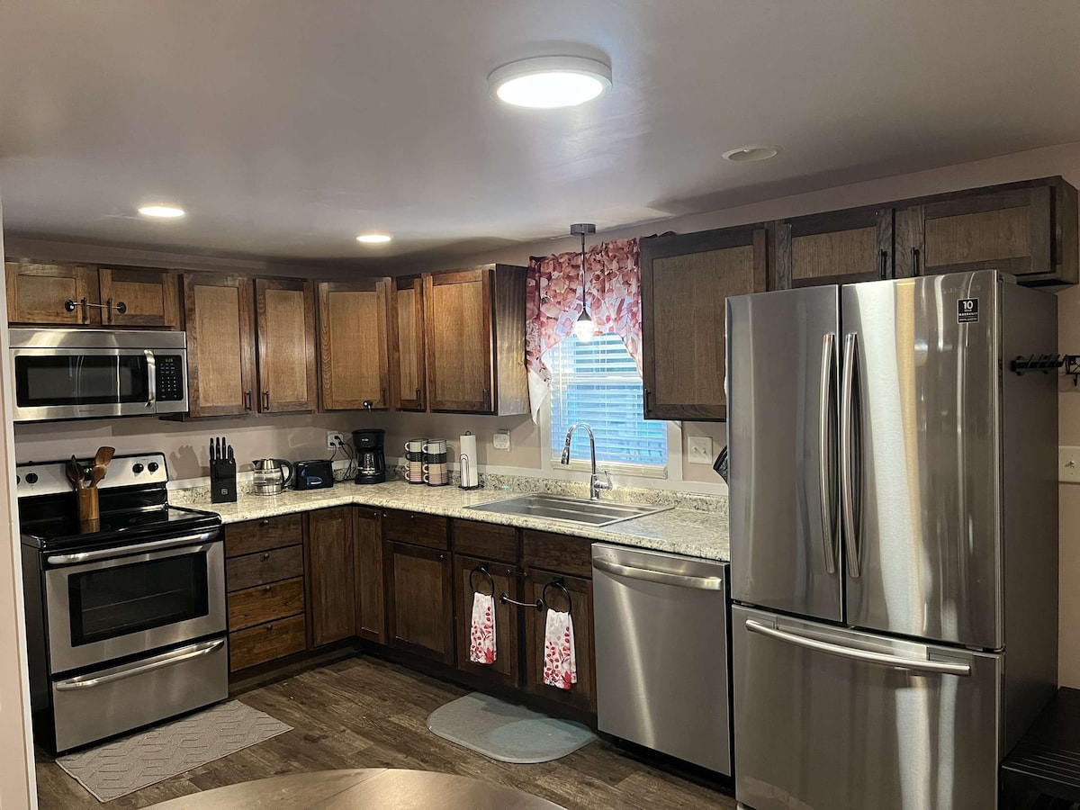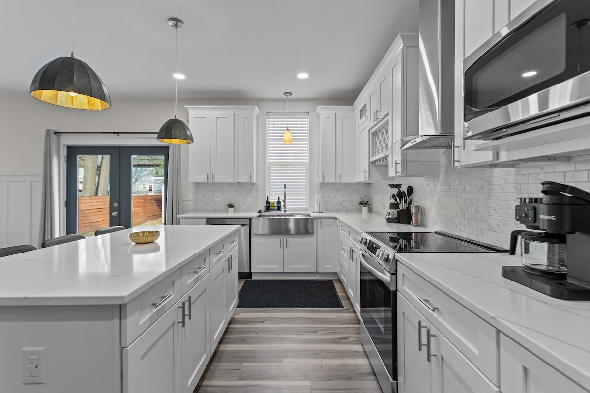 Tá spás codlata do suas le 8ar sa teach fairsing seo. Tá leaba rí, leaba bheag ar rothaí, tocht aeir, teilifíseán 55” le barra fuaime, cithfholcadán nuabhunaithe, tobán folctha agus seomra feistis sa phríomhsvuít. Tá leapacha banríona i dhá sheomra leapa eile. Bain sult as aerchóiriú/teas lárnach, meaisín níocháin/triomadóir, glas cliste, aláraim dheataigh agus múchtóir dóiteáin. Tá déantóir caife Keurig sa chistin le haghaidh d'fhanachta.