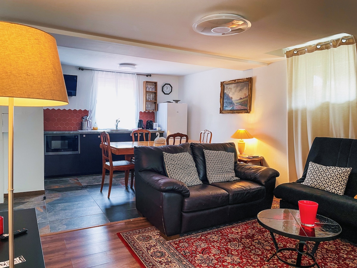 Cur Síos: Seomra suí ( tolg , teilifíseán ) Cistin oscailte lánfheistithe (miasniteoir, cuisneoir, micreathonnán/gríoscán, meaisín caife Senseo, earraí cócaireachta) 1 seomra leapa le leaba 2 dhuine (línéadach leapa breise) agus teilifíseán Seomra cithfholcadáin ina bhfuil cithfholcadán tílithe agus leithreas (tuáillí breise) Ardán feistithe le troscán gairdín, beárbaiciú gualaigh Cellier Spás glas príobháideach