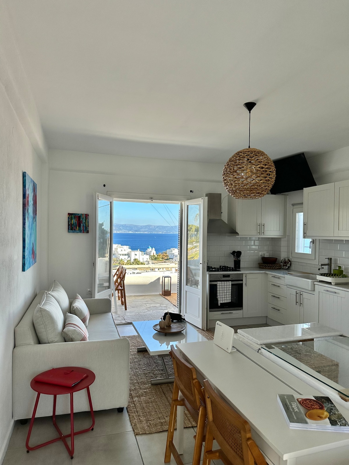 Sueno sunset villa for 2 is located in a nice area which combines beautiful sea-views,it is part of a complex consisting of 5 other apartments,It is 2,3 kilometers from the port of Parikia .The old town, the shops and the night life are 1200 meters away. It is 33 square meters and has a fully equipped kitchen, 1 bedroom, a living room, 1bathroom and veranda with jacuzzi is not heated. You deliver it clean with sheets and towels and there is not a service include during your stay.