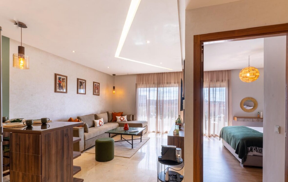Árasán nua - aimseartha teolaí de 72 méadar cearnach le hardán agus linn snámha atá suite go hidéalach i gcroílár Marrakech, i lár Guéliz. Siúlóid 10 nóiméad go hionad siopadóireachta Carré Eden agus tacsaí 15 nóiméad go dtí an t - aerfort. Tá gairdín álainn Majorelle agus Músaem Yves St Laurent laistigh de shiúlóid 10 nóiméad. Níl rochtain ach ag cónaitheoirí an fhoirgnimh ar an linn snámha ar an díon. Is árasán neamhspleách, príobháideach agus lánfheistithe é le Netflix HD/IPTV agus OPTAIC SNÁITHÍN 100mb/s