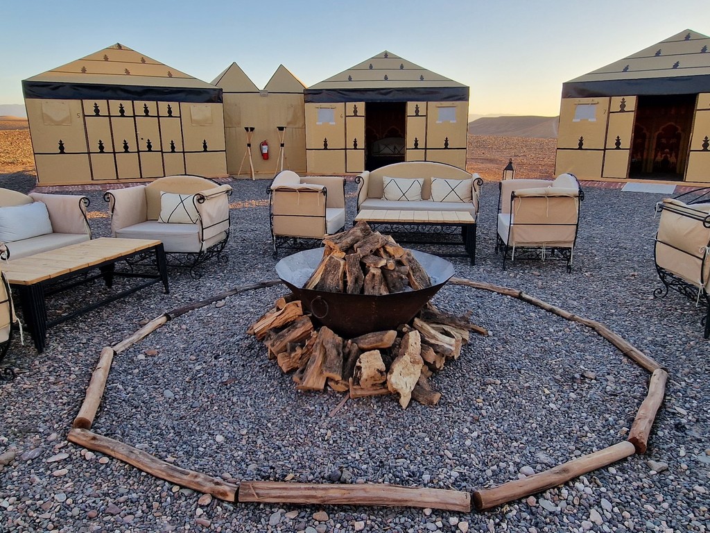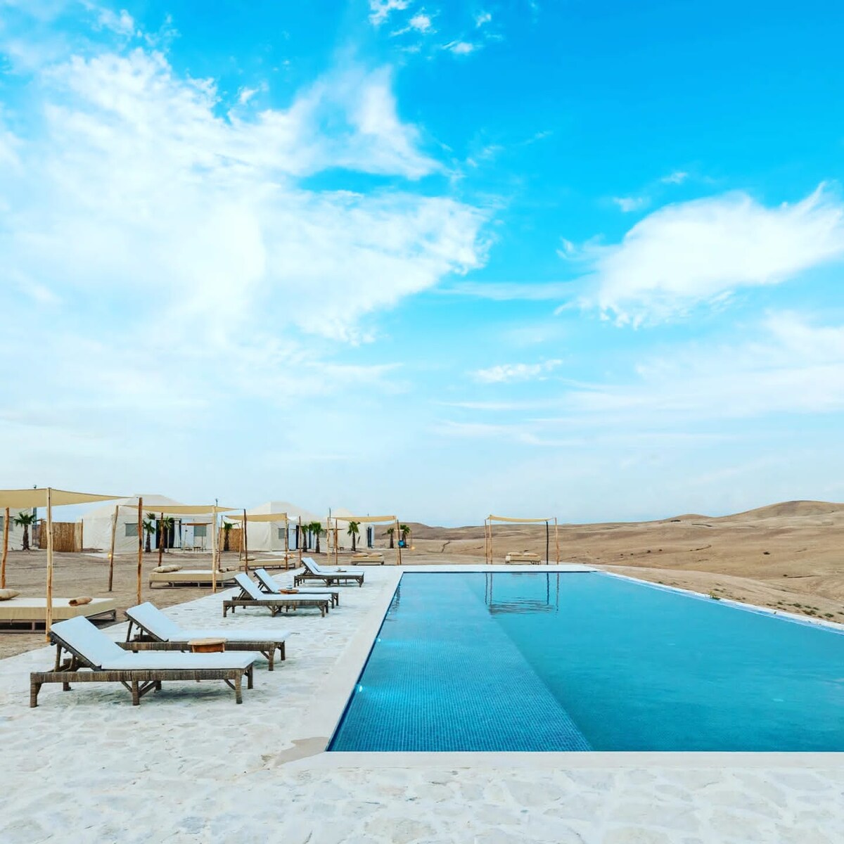 Faigh blaiseadh de Ghaineamhlach Agafay, 40 nóiméad ó Marrakech, i do phuball fuaimiúil príobháideach. Tá mealltacht bharántúil Mharacó agus áiseanna nua-aimseartha le chéile i ngach puball, ina measc sin leaba mhór, seomra folctha príobháideach, aerchóiriú agus mionbheár. Lig do scíth ag do linn snámha phríobháideach, bain sult as dinnéir rómánsúla faoi na réaltaí, agus bíodh meas agat ar radhairc iontacha de Shléibhte Atlas ag dul faoi. Foirfe do lánúineacha, do chairde nó do thaistealaithe atá ag lorg saoire shómasach sa bhfásach, glampáil eisiach, agus eispéiris eachtraíochta sa bhfásach.