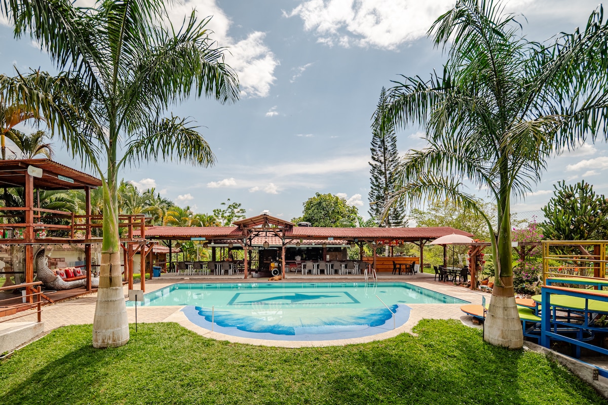 Scoir den torann agus déan ceangal arís leis na bunriachtanais ar an réadmhaoin draíochta seo in Eje Cafetero. Parthas nádúrtha atá deartha do ghrúpaí móra, do theaghlaigh, do thearmainn nó do cheiliúradh a bhfuil príobháideacht, nádúr agus compord á lorg acu in aon áit amháin. Ní hamháin go dtagann tú anseo chun codlata. Tar agus bain sult as eispéireas nach ndéanfaidh tú dearmad air: siúlóidí i measc crainn dhúchasacha, linn snámha ina bhfuil bána páistí, cluichí lasmuigh, cistin fheistithe, spásanna sóisialta agus radhairc a thugann deis duit anáil go domhain. Tá an réadmhaoin 38,400 m2
