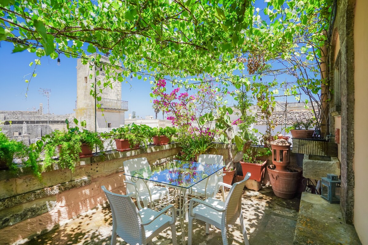 Ar an dara hurlár d'fhoirgneamh atá athchóirithe go hiomlán go luath sa naoú haois déag, comhtháthaíonn an teach áirithe seo an stíl ghlan, dhian agus íostach, le draíocht agus atmaisféar ailtireacht Salento. Ní hamháin turgnamh dearaidh, ach teach i lár an aeir ar fionraí, atá feistithe le gach compord in árasán mór aerach geal. Críochnaigh an t - eispéireas, an suíomh lárnach agus an t - ardán mór le radharc iontach ar na páláis uaisle mhaorga i gcloch Lecce.
