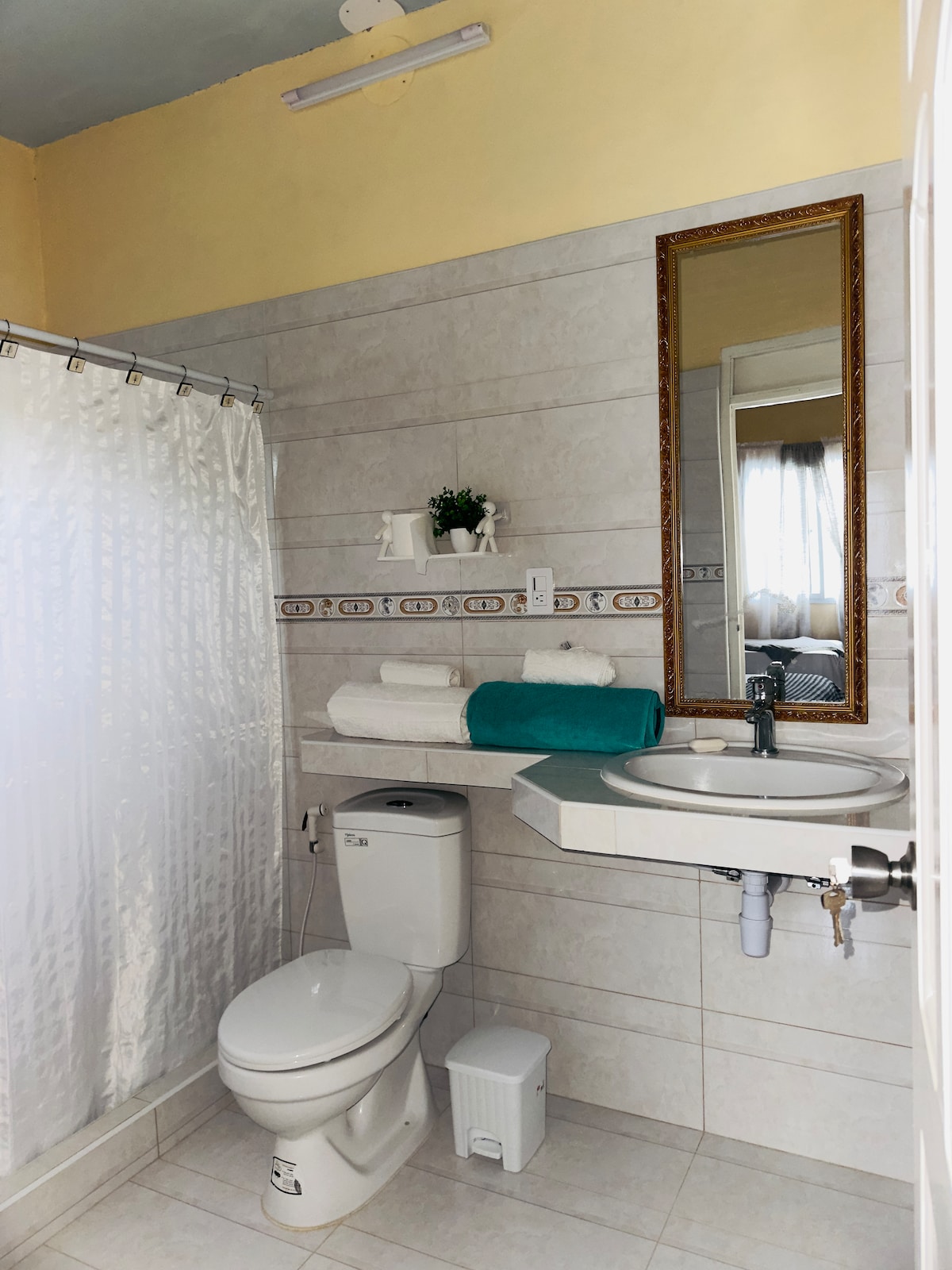 Es un apartamenento independiente amplio. Con un dormitorio con dos camas, (una grande y otra más pequeña), aire acondicionado, caja fuerte, perchas para la ropa y televisor. Un baño con agua fría y caliente; cocina equipada con todo para la elaboración de alimentos (microondas, cafetera, tostadora, ollas, fogón de gas, refrigerador), una pequeña mesa plegable y tres taburetes para comer, uso de la lavadora. Una terraza común rodeada de plantas con sillones, mesa y sillas y un hermoso jardín.