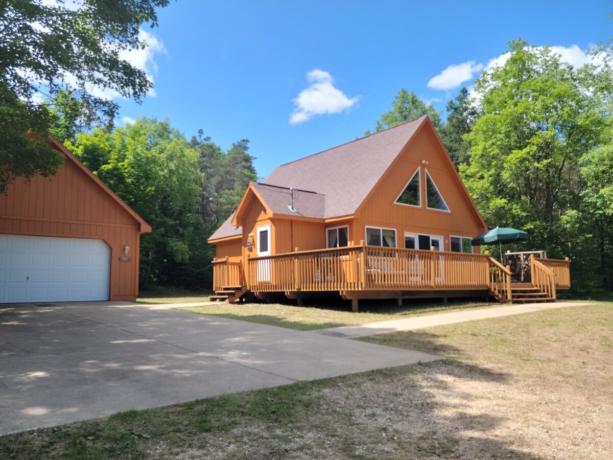 This Chalet Cabin A-frame in the woods features 3 bedrooms and comforts for four season stay. The kitchen has open concept to spacious living room with natural fire place. Two full baths, first floor laundry, outdoor deck and firepit. Ride directly to snowmobile trails, 25-30 min ski at Caberfae & Crystal Mountain, mountain biking, road cycling to Traverse City. Hiking, canoeing/kayaking and ATV/UTV. Hunting season is underway, check Michigan websites for authorized surrounding areas.