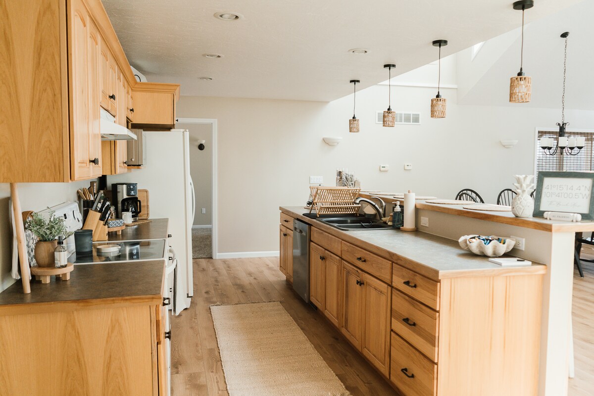 Cruinnigh le chéile agus lig do scíth ag Ash Breeze Harbor, ár mbaile i gcroílár Ogallala NE. Díreach 15 nóiméad ó Loch McConaughey is féidir leat do lá a chaitheamh ar an uisce agus ansin teacht abhaile. Is leatsa an teach iomlán nuashonraithe & faoi throscán iomlán a úsáid agus taitneamh a bhaint as. Ligeann an plean urláir clasaiceach w/ oscailte do ghrúpaí móra fanacht le chéile. Tá an cúlchlós fairsing fálaithe agus tá deic sheomra in aice leis an teach agus póirse clúdaithe compordach amach chun tosaigh. 2 Ríona, 7 gCúpla, tolg tarraingthe amach & tá spás ann do níos mó!