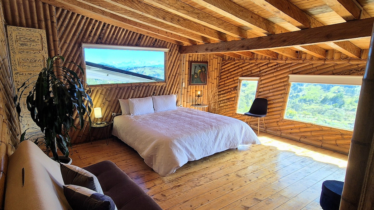 Un ambiente diseñado para grupos, familias o viajeros que buscan una experiencia de hospedaje rodeada de arte y naturaleza. Equipado con una cama Queen y dos camas sencillas, este amplio espacio ofrece comodidad superior acompañada de una vista panorámica privilegiada. Cuenta con: • Cama Queen y dos camas sencillas • Baño privado con ducha • Piso en madera natural • Vista panorámica hacia las montañas Incluye desayuno orgánico con productos de la huerta.